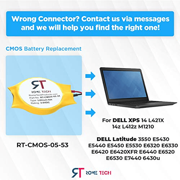Batería de Respaldo CMOS BIOS CR2032 para Dell Latitude 3550 E5430 E5440 E5450 E5530 E6320 E6330 E6420 E6420XFR E6440 E6520 - Rome Tech RTC CMOS con 2 Pines y Cable (1 Unidad)